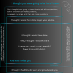 I’m 6 years old. I’m at Fisher Fazios with my mom. It’s where we get food and stuff. Someday it will be a library, though. I get to be in the front of the grocery cart close to my mom. I feel safe like a baby. I’m holding onto the red plastic bar around the front of the silver cart looking down at my long legs swinging, and feet dangling too low in my saddle shoes. Mommy said I’m too big for this but then she let me sit here anyway today. She’s talking to the grocery lady who is putting our food in bags.